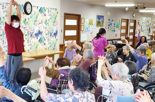 在宅で生活する方々が通い、看護師の健康チェック、理学・作業療法士等によるリハビリテーションを受ける施設です。午後からは部活動(クラブアクティビティ)として卓球・風船バレーボール・ゲーム・パチンコ・麻雀などなどを通じて仲間づくり、生きがいづくりを行いADLの改善とともに生き生きした生活を維持する、あるいは取り戻すことを目的としています。入浴や食事の提供、車での送迎があります。